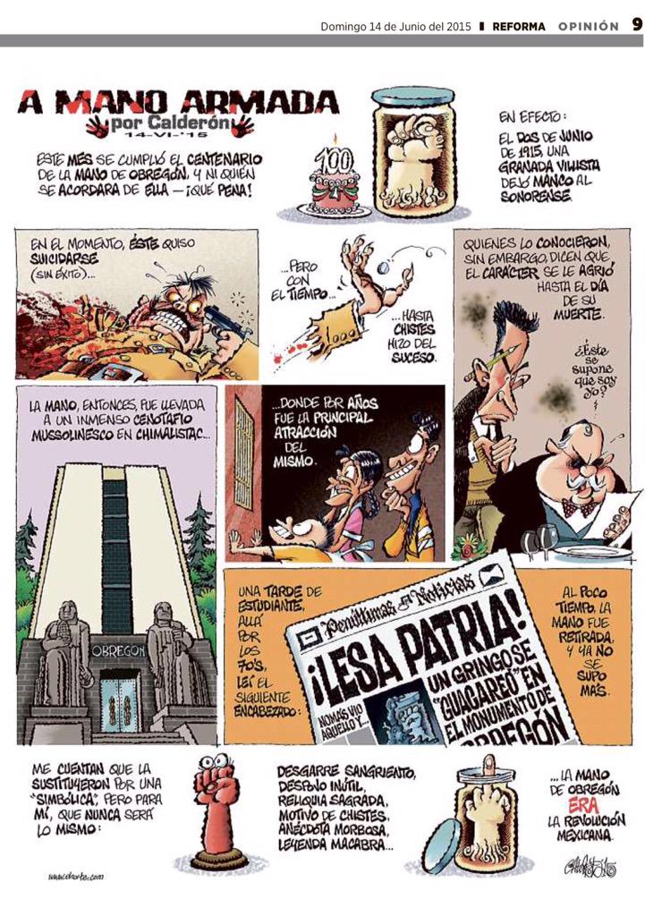 Tres apuntes sobre el apunte de Calderón: 1.- El mausoleo a Obregón se construyó donde estaba el restaurante campestre «La Bombilla», lugar en el que fue asesinado por el presunto caricaturista León Toral. Dado que ya era presidente electo, fue necesario nombrar a un presidente interino en lo que se convocan a nuevas elecciones; dado que el ganador Pascual Ortíz Rubio renunció justo al pasar la mitad de su periodo (y tras un atentado fallido), fue necesario nombrar un presidente sustituto. Por eso en el Maximato tuvimos tres presidentes débiles y un «jefe máximo de la Revolución» muy poderoso; los periodos presidenciales duraban cuatro años, y tuvimos tres presidentes de dos años. 2.- El chiste que contaba Obregón -con fama de político ladrón- es que rescató su mano de la batalla de Celaya porque lanzó al aire una moneda de oro… y la mano «brincó» desde dónde estaba para atraparla. También decía que era falso que fuera el presidente más ladrón de la historia: «porque yo solo tengo una mano y los demás roban con las dos». 3.- La mano fue devuelta a la familia no por el incidente del gringo que vomitó en los setentas, sino porque «fue parte de las reformas neoliberales privatizadoras…» Digo, porque ya estaba muy deteriorada y el presidente Carlos Salinas dio la orden y fue cremada por la familia. Cartón de hoy por Paco Calderón, tomado desde Twitter.