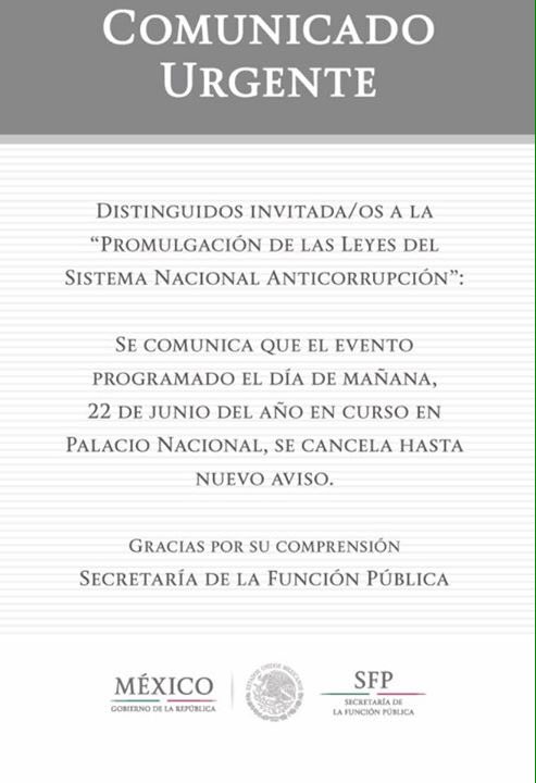 Y hablando de problemas de mala comunicación… Habría un evento protocolario para la promulgación de las leyes de Sistema Nacional Anticorrupción hoy en Palacio Nacional. Ayer, a menos de 24 horas del evento, se envió una cancelación a todos los invitados -que pueden ver abajo-. Entendemos que es una decisión prudente no reunir al Presidente, Gabinete y miles de invitados «VIP» en Palacio Nacional cuándo están programadas marchas de maestros para protestar por lo de Oaxaca y de médicos en contra de la inseguridad que vive el sector -y que no se les dejará entrar al Zócalo-. Pero la señal de que o bien se esconden de las protestas, o peor, que se oponen al Sistema Nacional Anticorrupción, no ayudan para nada. Horax en Milenio (y comunicado de la Secretaría de la Función Pública y Presidencia de la República)